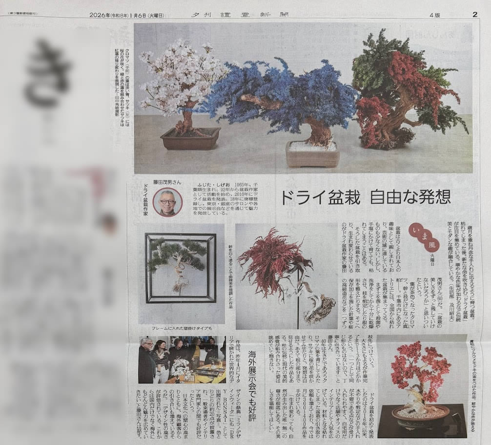 読売新聞「ドライ盆栽」枯れた枝葉によみがえる伝統美 DRY BONSAI® Tokyo GINZA Salon 読売新聞【きれい】「ドライ盆栽」枯れた枝葉によみがえる伝統美 ドライ盆栽が2026年1月6日発行読売新聞で紹介されました! 【きれい】… お知らせ,メディア,過去のイベント等 2026年1月14日