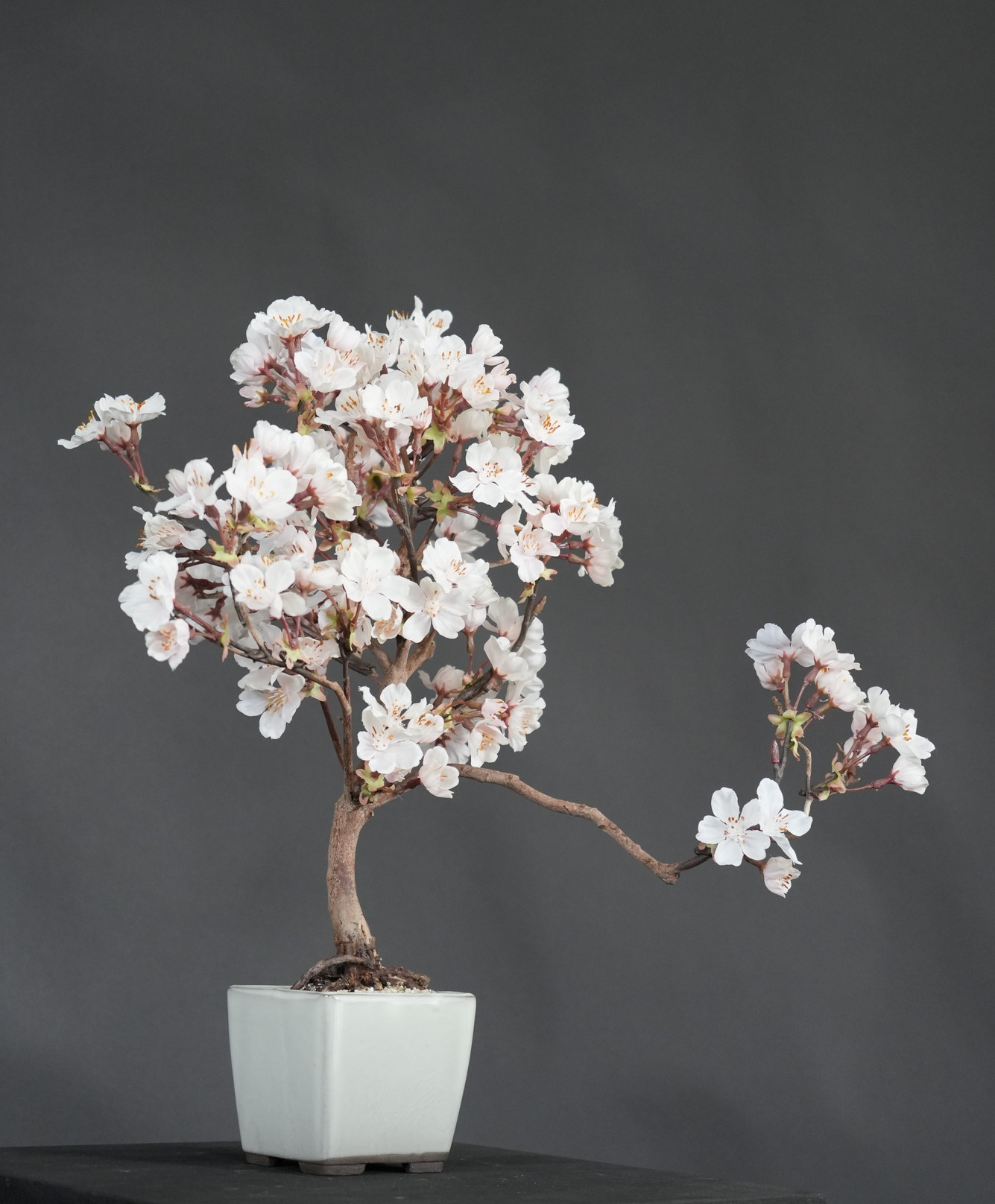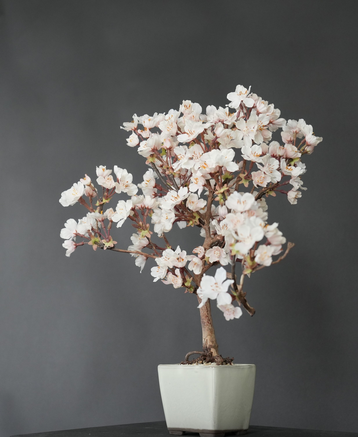 長年生きてきた、さらに盆栽の特別な技術を施した、佇まいの素晴しい盆栽。そこには大変な時間と労力がかかっています。長年の盆栽眼で価値のあるものを厳選した枯れ盆栽。さつきの枯れた盆栽にアーテイフィシャルの桜の花をつけ、見事な美しい姿に設え直しました。鉢中は砂で固めていますのでこぼれや虫の心配は有りません。「再生」や「再定義」をテーマに藤田が独自に開発したドライ盆栽®。今、世界中で大変な人気になっています。特別な贈り物やインテリア、オブジェにお勧めします。